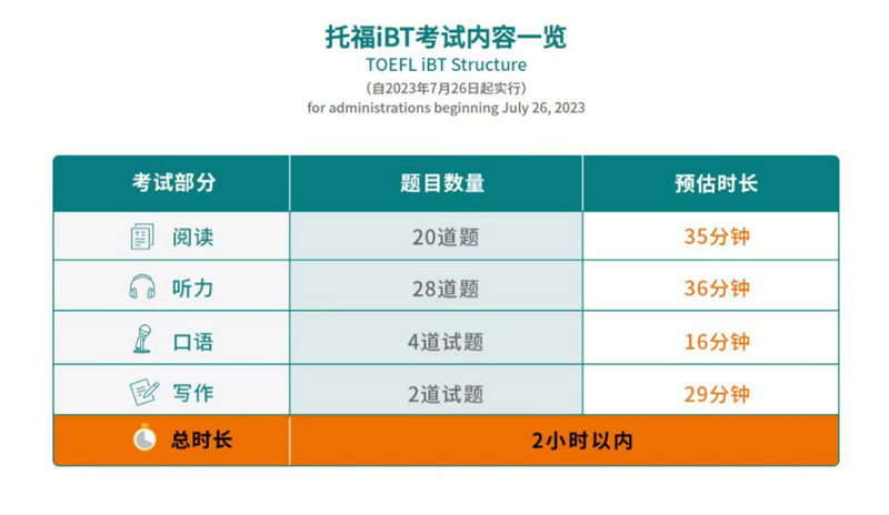 自2023年7月26日起, 托福iBT考試的時(shí)長(zhǎng)將由三小時(shí)縮短至兩小時(shí)以內(nèi)。具體調(diào)整如下: